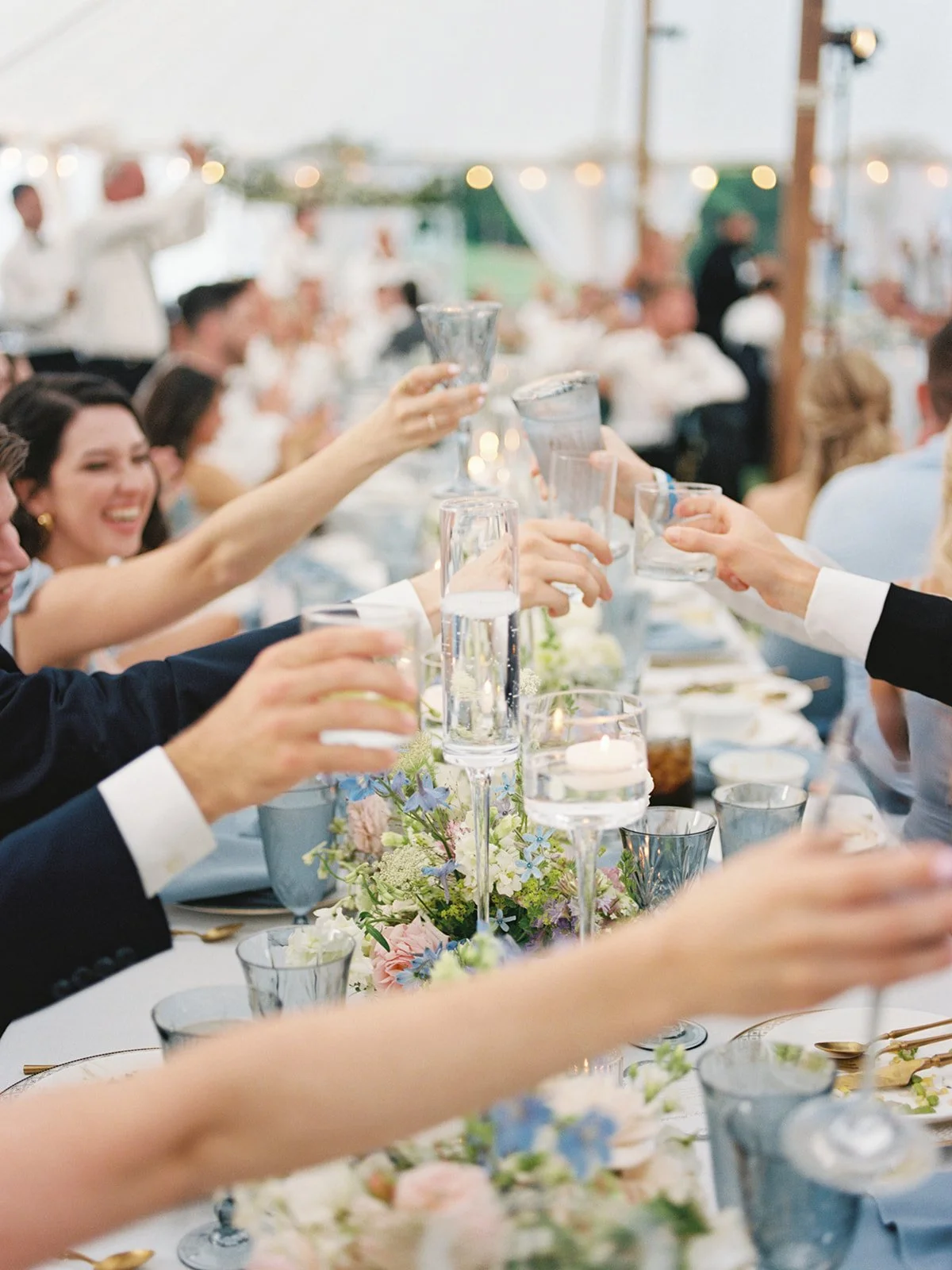 For Emily and Brad's sun-kissed celebration, we created a floral story that felt both timeless and deeply personal. The bride’s love of blue hydrangeas became a thread woven throughout the reception tent installations and carefully placed arrangements. A sweeping 10-foot floral arch framed the lawn and lake views, setting the stage for a ceremony that felt as peaceful and wild as the landscape itself. The florals reflected the effortless grace of a lakeside wedding—lush, joyful, and naturally elegant.